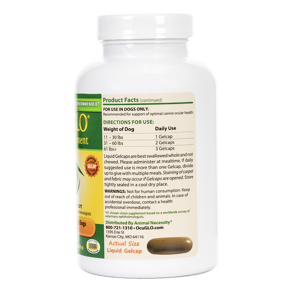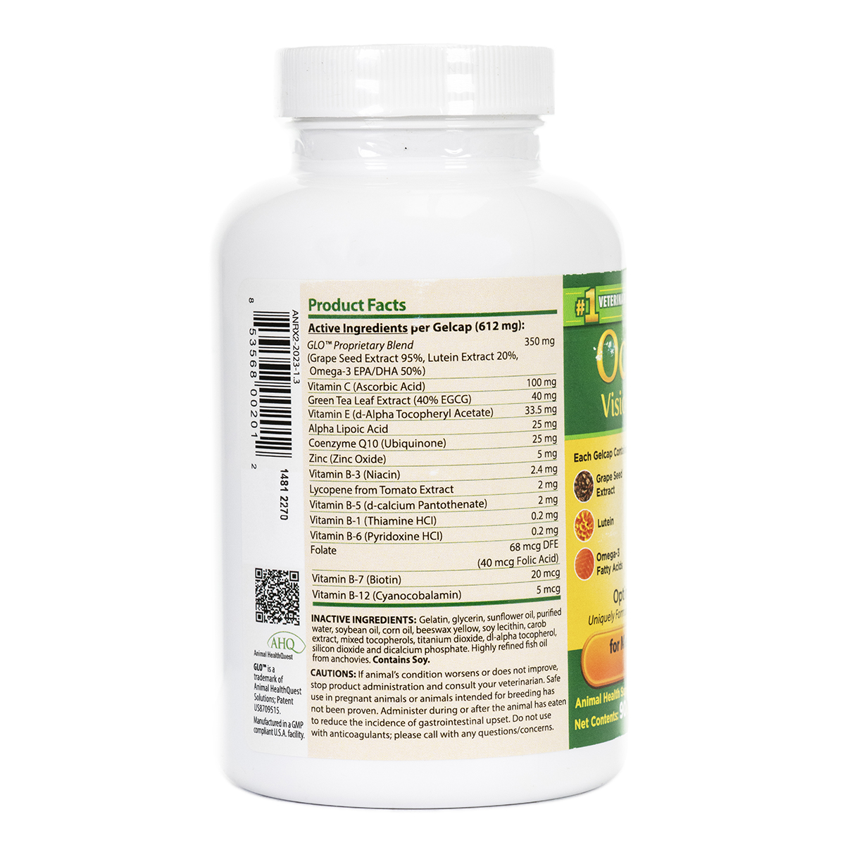 Vision Supplement for small dogs less than 5kg formulated by Veterinary Ophthalmologists. Supplement Facts: Serving Size: 1 Gelcap: GLO Rx™ Proprietary Blend (Grape Seed Extract 95%,
